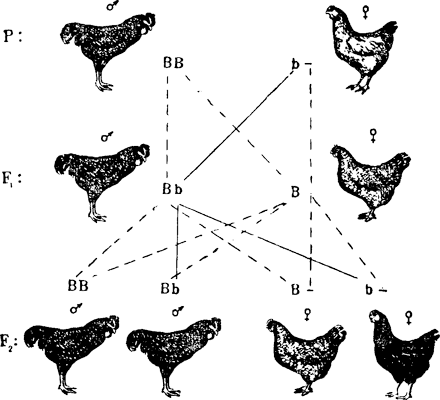 Метод раннего — в однодневном возрасте — предсказывания пола цыпленка еще в 1922 году предложил советский генетик профессор А. Н. Серебровский. После этого Пеннет приступил к работе по созданию пород, у которых различия видны уже в однодневном возрасте. Он вывел несколько таких пород, однако они не выдержали конкуренции по яйценоскости с леггорнами. А метод, который был предложен Серебровским, и сейчас применяется в практике. В птицеводстве ценят гибриды первого поколения от скрещивания красного род-айленда с полосатым плимутроком. Их ген полосатости, сцепленный с полом, позволяет в однодневном возрасте отличать петушков от курочек. Рассмотрим это скрещивание. У род-айлендов окраска красная, а у плимутроков выбранной нами породы перо, как у кукушки — черное с белыми полосами. У кур самцы гомозиготны по половой хромосоме, а у самок она одна. У-хромосома у птиц пока не найдена. Генов, которые вызывают полосатость перьев, у петухов два, у кур один. И уже по этому можно определить пол цыплят — у петухов белые полосы на пере шире. Для скрещивания мы возьмем самку полосатого плимутрока и самца род-айленда. Гаметы курицы будут двух типов. Один из них несет доминантный ген, другой не несет. Гаметы петуха, напротив, однотипны: все они несут рецессив полосатости. От оплодотворения яйцеклетки, несущей доминантный ген, образуется петушок, от оплодотворения другой яйцеклетки, без доминантного гена, а значит, без Х-хромосомы, образуется курочка. У цыплят нет пера — тело покрыто пухом. Однако уже в однодневном возрасте петушки отличимы от курочек: у них на затылке белое пятно. В дальнейшем жепетушки приобретают полосатую окраску, курочки же оказываются красными.