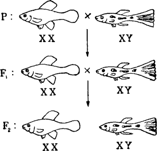 Этот тип наследования животноводы называют наследованием крест-накрест. Если признак в F1 от самца переходит к самкам, а от самок к самцам, значит, он сцеплен с полом, то есть ген его находится в Х-хромосоме. А в У-хромосоме гены обнаружены лишь у одного домашнего животного — рыбки гуппи. Здесь в У-хромосоме самцов множество генов окраски. Их легко проследить и выявить. Для этого самца достаточно скрестить с самкой из другой породы. Все пятна, штрихи и точки, которые сыновья унаследуют от отца, зависят от генов У-хромосомы.