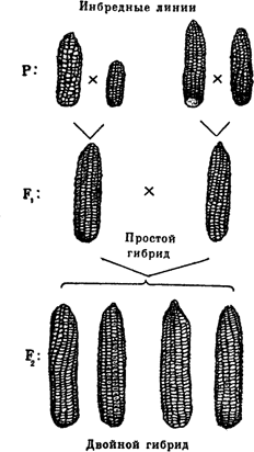 Кёльрейтер, обрусевший немец, работал в Петербурге в XVIII веке. Он скрещивал табаки, и некоторое из его гибридов оказались мощнее обоих родителей. Это явление было названо гетерозисом или гибридной мощностью. Однако гибриды Кёльрейтера и многих других значительно отличаются от тех, что имели Ист и Джонс. Раньше гетерозис получали при скрещиваниях между сортами или породами. Однако Ист и Джонс показали, что наилучший эффект дают инородные линии. В дальнейшем шли споры: так ли ото? Опыты подтвердили: так. И все же — мы скоро в этом убедимся — от межпородных гетерозисных гибридов отказываться не стоит. Особенно там, где получение инбредных линий очень уж дорого, то есть у всех животных крупнее курицы и кролика.