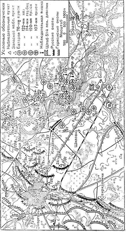 Схема 10. Штурм крепости Перемышль 5–7 октября 1914 г. Участок атаки 3-й стрелковой бригады. б) На южном участке атаки, обеспечивающей левый фланг главной атаки, 3-я стрелковая бригада по линии от р. Вяр у д. Малховице до Княжице включительно. Легкие полевые батареи находились при своих дивизиях и стрелковой бригаде. Полевые тяжелые артиллерийские дивизионы расположились в районах, указанных Дельвигом, под личным руководством которого производилась артиллерийская разведка и выбор огневых позиций; им же были указаны районы действий огнем, а именно: 3-й тяжелый дивизион в составе 7-й и 8-й гаубичных 152-мм батарей, наблюдательный пункт — выс. 254 (у сев. опушки Вельки-Ляс); 7-я батарея у южной окраины Шехине (за выс. 254), 8-я батарея севернее Вельки-Ляс, за выс. 254 (с наблюдательным пунктом). Район действия огнем: форты Гурко (14), Борек (15) и Седлиска (1), северная группа батарей Седлиска; дальность 5–6 км. 1-й тяжелый дивизион в составе 1-й и 2-й гаубичных 152-мм батарей, наблюдательный пункт — выс. 311 к северу от д. Новоселки; обе батареи к западу отд. Балице, между нею и выс. 311 (с наблюдательным пунктом). Район огневого действия: форты Седлиска (1) и Борек (15) и батареи 11 — 15 Седлиской группы; дальность 6–8 км. 2-й тяжелый дивизион в составе 4-й и 5-й гаубичных 152-мм батарей, наблюдательный пункт — выс. 306 (Лисковице); обе батареи у северной окраины д. Стронновице. Район огневого действия: Седлиская группа, форт 4 (на западном берегу р. Вяр, северо-западнее д. Германовице); дальность 5–7 км. Полевая тяжелая батарея 107-мм пушек — у д. Дроздовице имела специальную задачу: обстрел во внутренней ограде крепости форта 20 и крепостных складов; дальность 9 — 11 км (схемы 9 и 10). Тяжелые батареи, расположенные по дуге, охватывающей Седлискую группу с северо-востока, востока и юга, могли сосредоточить по ней огонь с разных сторон: по северному району батарей и укреплений Седлиской группы — с трех сторон, по южному району — с двух. При наличии слабой количественно и качественно тяжелой артиллерии успех действий мог быть достигнут лишь при сосредоточенном огне, требовавшем умелого центрального управления подчиненной ему артиллерией. Поэтому генерал Дельвиг со свойственной ему энергией приложил много усилий не только для выбора наблюдательных пунктов и позиций батарей, но и для организации связи тяжелых дивизионов между собой, с легкой артиллерией, с пехотой и с командованием корпуса, штаб которого располагался в Рудники у м. Мосциска (на шоссе во Львов). Однако ограниченный запас телефонного провода и недостаток средств приданной телеграфной роты не позволили полностью осуществить намеченную схему связи, что крайне затруднило управление огнем тяжелых артиллерийских дивизионов и в значительной степени помешало необходимому сосредоточению их огня. Связь тяжелых дивизионов была установлена только со штабами ближайших дивизий и, кроме того, 3-го дивизиона с 230-м полком 58-й дивизии и с 73-м полком 19-й дивизии, 1-го дивизиона — с командиром 2-й бригады 19-й дивизии, 2-го дивизиона — с командиром 1-й бригады 69-й дивизии. 4 октября не успели занять назначенное им приказом положение только 19-я пехотная дивизия и 3-я стрелковая бригада. Но в течение дня 4 октября командир 19-й артиллерийской бригады с командиром дивизионов и батарей произвел рекогносцировку артиллерийских позиций в районе Балице-Ново