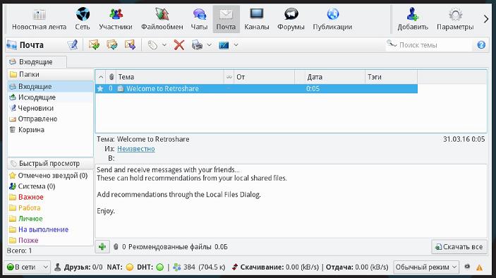 Позволяет отправлять сообщения любыми пользователям RetroShare, даже находящимся оффлайн. К письму можно прикрепить файлы любого размера и содержания.