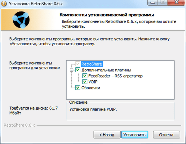 Производим выбор дополнительных компонентов. Установленные оболочки позволят позднее изменить внешний вид RetroShare. По умолчанию устанавливается 7 стилей графического интерфейса, а также 13 спецификаций стиля. Плагины реализуют дополнительный функционал клиентской программы, напиример, VoIP.