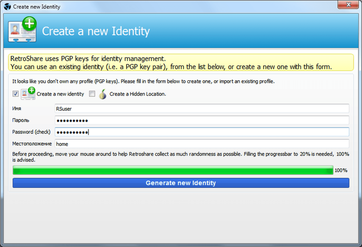 При первом запуске RetroShare выводит на экран окно мастера, помогающего пользователю создать личный сертификат: