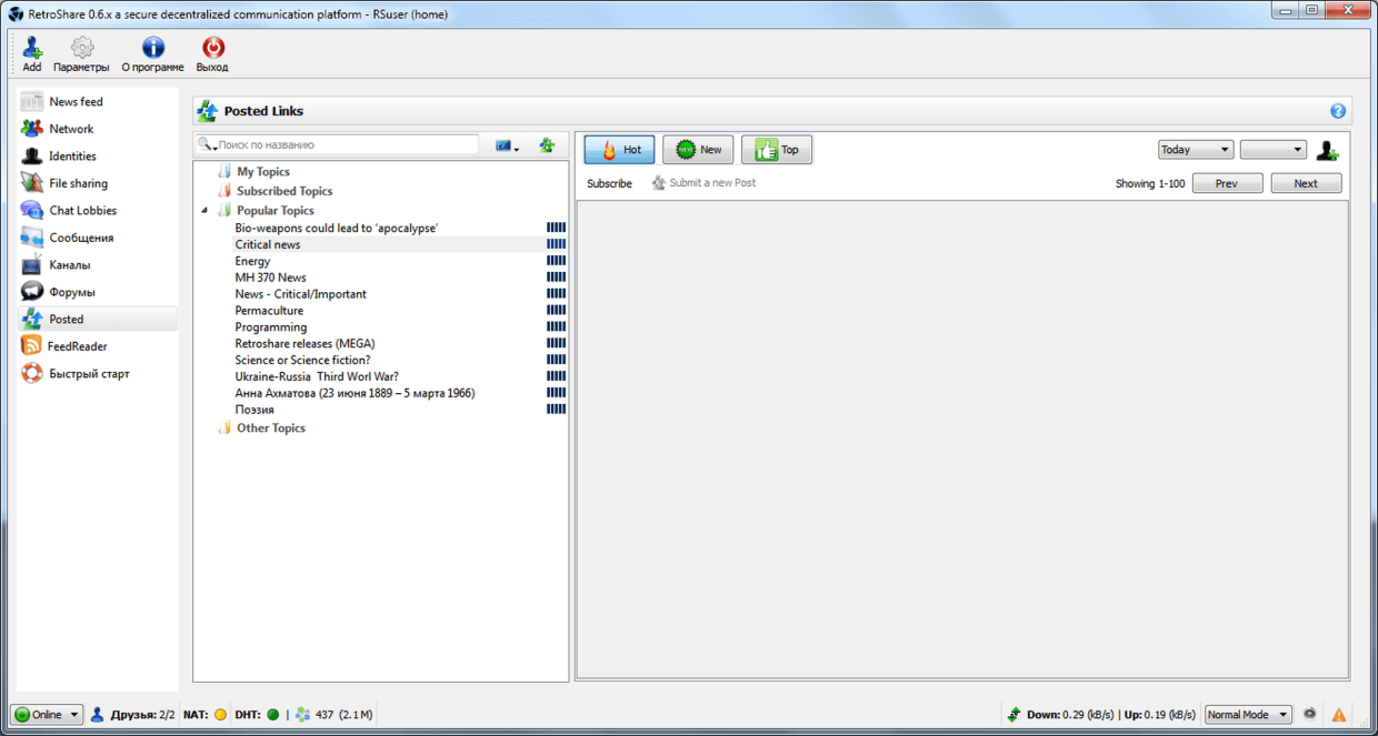 Следует отметить, что на начальном этапе подключения к анонимной криптосети загружаются лишь списки контента, но не сам контент. Для того, чтобы каналы или форумы приносили с собой контент, на них следует подписаться, щёлкнув правой кнопкой мыши и выбрав пункт «Subscribe».