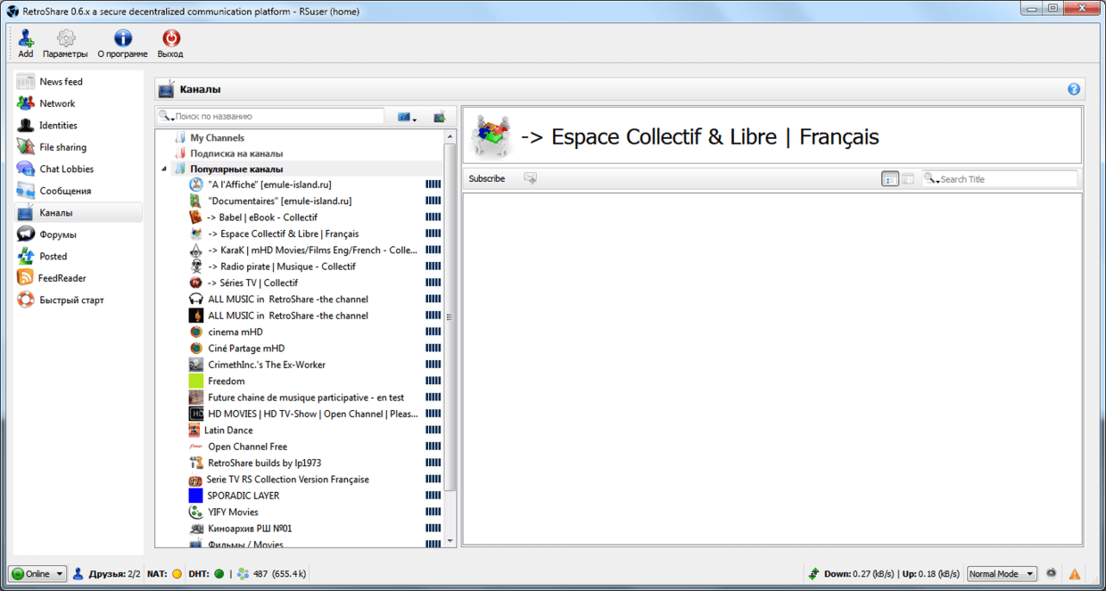 RetroShare на середину августа 2014 года – в основном франкоговорящая платформа. Из 260 более или менее регулярно обновляемых каналов свыше 100 содержат франкоязычный контент – почти половина. Приблизительно такое же количество каналов, рассчитанных на англоговорящих пользователей, а ведь английский – самый распространённый язык на планете. Десятка полтора каналов содержат немецкий контент, и по пальцам одной руки можно сосчитать русскоязычные каналы, равно как и каналы для других лингвистических групп. Количество пользователей в сетевом крипточате для франкоговорящих пользователей почти всегда превышает аналогичный крипточат для англоговорящих, а ведь в последнем собираются и немцы с испанцами, и чехи с румынами, и шведы с русскими, и те же французы… Сложно сказать, связано ли превалирование французов в RetroShare с тем, что один из её ведущих разработчиков – француз, или с тем, что у французов есть природное чутьё на красивые вещи, но вышеуказанный факт имеет место быть.□ □ □ □