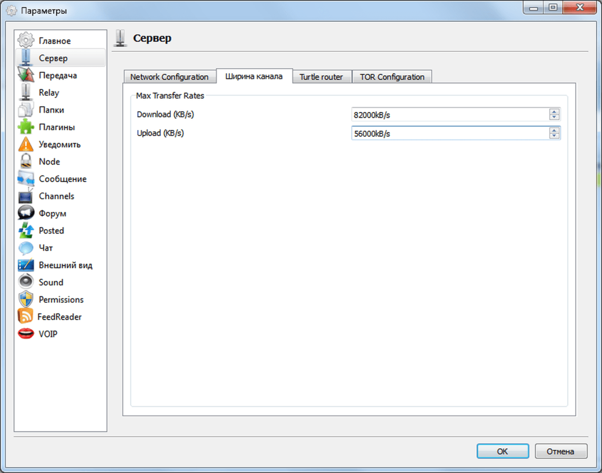 Раздел настроек „Сервер → Ширина канала“: