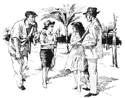 Я выскочил вперед, мариноиды встрепенулись, или точнее говоря, вздрогнули. Мужчины крепче уперлись в землю; женщины поднялись вверх по воде, плывя на одном боку, размахивая перепонкой, соединявшей обе ноги, как большим рыбьим хвостом. Один из мариноидов крикнул что-то. Я ясно мог различить его голос — повидимому, слова отрывистого приказания. Нона шла за мною, не отступая ни на шаг, готовая помочь мне в схватке. — Скорей! — крикнул я. — Лови их, Нона! Напрасно! Мариноиды одним прыжком набросились на нас так быстро, что мы не могли бы вырваться от них, если бы даже попытались. В одно мгновение они оказались над нами; я не успел ничего сделать, как они опрокинули меня на землю и с поразительной для их трехфутовых щупальцев силой охватили меня и стиснули. Трое мужчин занялись мною, а двое держали Нону. Но они не пытались ранить нас, наоборот, они, казалось, избегали этого. Шестой марионид — тот, который отдал приказ — быстро нарвал длинные, похожие на веревки, пучки растений. По его приказанию нас подняли на ноги. Женщины спустились на песок и с любопытством рассматривали нас, обмениваясь между собой непонятными для нас словами, но жесты их казались вполне разумными. Наконец, туго связали нам по бокам руки и повели нас по песку. Они вели нас вперед, из широкого песчаного пространства по направлению к дальним холмам. Женщины плыли над нами; мужчины шли группой, подталкивая меня и Нону. Мы могли бы бежать быстрее их, и один раз вырвались вперед. Но они поплыли за нами и мгновенно поймали нас. И один из них сделал нам предостережение жестом, не оставлявшим никаких сомнений. Скоро я увидел, чем была занята группа мариноидов прежде, чем встретила нас. Мы случайно прошли мимо больших корзин, повидимому, сплетенных из морских растений. В эти корзины они складывали собранные с морского дна раковины и моллюски, затем другие мариноиды убирали их и увозили. Все это я узнал потом; в то время ни я, ни Нона ничего не понимали. По мере того, как мы продвигались вперед, вид вокруг нас постепенно менялся. Растительность становилась гуще, пока не превратилась в настоящий лес. И мы, казалось, шли по дороге, по прочищенной тропинке. Внезапно я услыхал крик впереди. Женщины мариноиды, которые плыли над нами, сразу опустились вниз. Предводитель нашей группы что-то сказал, и они все сошли с дороги, таща нас за собой. Крик впереди стал громче. Что-то показалось издали, двигалось по направлению к нам нечто в роде саней, устроенных из огромной раковины. Повозка эта скользила по песчаной дороге, влекомая каким-то странным плывущим животным. В санях сидели два мариноида — один высокий, другой ниже. Сани остановились рядом с нами. Тот из седоков, который был ниже, встал и громко закричал. И внезапно я понял, что он кричит на меня. Мариноиды, захватившие нас в плен, лежали ничком на песке и заставили Нону лечь вместе с ними. Но в волнении, — ибо то был вождь их племени — они забыли обо мне. Я недоумевающе таращил глаза на сердитое лицо стоящего в санях; и внезапно, разгневанный моей дерзостью, тем, что я продолжаю стоять, не оказывая должного уважения их вождю, он чем-то бросил в меня. Я увидел, как что-то выскочило из его руки, что-то длинное, тонкое и заостренное. Оно пронеслось по воде, как копье по воздуху, и попало мне в голову, нанеся мне легкий удар.