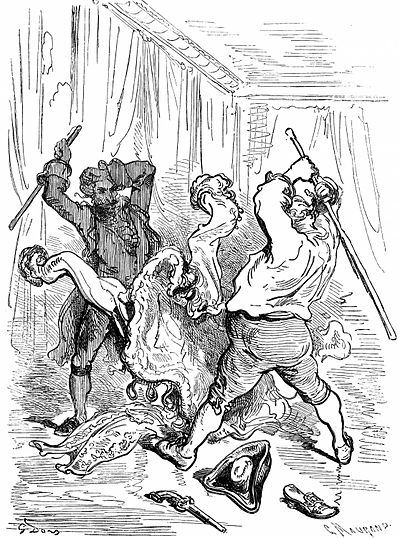 На другой день я опять поехал на любимой лошади по своему обширному имению. Дела было много и вернуться пришлось совсем уже поздно. В сумерки я заметил в парке какого-то зверя не малых размеров. Сразу я думал, что это собака, но быстро въехав во двор, и отдав слуге лошадь, я направился в парк без всякого оружия полюбопытствовать, кто это расхаживает в парке. Я пробежал по одной дорожке, повернул на другую, как вдруг встретился с огромным, да еще голодным волком, он разинул пасть и, пощелкивая зубами, прямо шел ко мне. Я не думал бежать от него, т. к. в благородной семье Мюнхгаузенов еще не было такого случая, чтобы кто-либо бежал от опасности. Волк, не долго думая, бросился на меня, но мне удалось мигом сунуть в пасть ему сжатый кулак так далеко, что от боли он не мог даже двигать челюстями. Волк остановился и глядел на меня жадными глазами, надеясь что я выну руку, и тем дам ему возможность растерзать меня. Я засунул руку еще дальше, захватил все его внутренности и вывернул их через рот, точно перчатку на изнанку. Он так пролежал до самого утра. Дома я никому не рассказывал об этом происшествии. — Что, в самом деле, говорит о таких пустяках! Утром садовник нашел вывернутого на изнанку волка и донес об этом графу, а тот сразу догадался:
