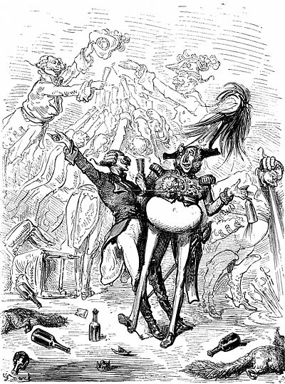 Судя по удивительным движениям задней половины я был уверен, что она находится в полной жизнеспособности и тотчас же послал за ветеринарами и кузнецами, чтобы они сообща решали, как соединить обе половины моего животного. Не долго думая они решили сшить их прутьями лаврового дерева, так как больше ничего не нашлось у них под руками. Рана очень скоро совершенно зажила, не оставив никаких следов. Но при этом произошло нечто невероятное. Лавровые ветки пустили корни в тело лошади и выросло большое лавровое дерево с прекрасными ветвями, образовавшими нечто вроде беседки надо мной. Таким образом я был увенчан густым не вянувшим лавровым венком и в таком виде мне не раз приходилось с триумфом въезжать в занятые города и крепости. Следствием наших непрерывных сражений и побед было одно неприятное для меня приключение. Я так храбро, долго, и так беспощадно дрался с неприятелем, что моя правая рука так расходилась, что продолжала подыматься и опускаться, и после битвы все мои усилия остановить ее оказались безрезультатными. Оставить без внимания такое явление я так же не мог из боязни ранить себя или своих товарищей. Чтобы остановить руку, мне пришлось подвязать ее, как после вывиха, и в таком положении носить ее в продолжении восьми дней. Вы еще не забыли, вероятно, моего рассказа о том как я у всех на глазах вскочил на взбешенную лошадь и, усмирив ее, заставил исполнять все мои желания. Такая смелость не позволит вам усомниться в том, что я намерен вам сейчас рассказать.
