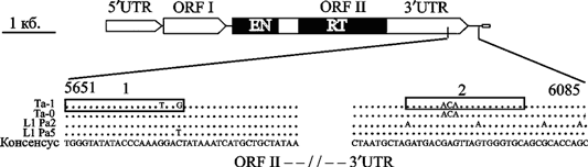 5’-нетранслируемый регион (5’-UTR) — является внутренним промотором транспозона, не зависящим от окружающих его нуклеотидных последовательностей. Далее идут открытая рамка считывания I (ORF I), кодирующая 40 кд (р40) РНК-связывающий белок (RNA-binding protein); короткий межгенный регион (intergenic region) протяженностью 63 п.о., содержащий стоп-кодон для всех рамок считывания (мРНК L1 атипична для мРНК млекопитающих, так как она бицистронна); и малоэффективная открытая рамка считывания II (ORF II), кодирующая L1-репликазу (L1 replicase). Она содержит три консервативных домена: NH2-терминальный домен эндонуклеазы (endonuclease, EN), центральный домен обратной транскриптазы (reverse transcriptase, RT) и COOH-терминальный цинк-шарнирный домен (COOH-terminal zinc knuckle-like domain — на схеме не показан). Далее идет 3’-нетранслируемый регион (3’-UTR), содержащий консервативный G-обогащенный полипуриновый мотив (G-rich polypurine motif). AATAAA поли А-сигнал (AATAAA poliA signal) требуется для терминации РНК полимеразы II типа (RNA polymerase II, Pol II). Геномные копии L1 обычно заканчиваются А-обогащенным участком (poliA tail, показан прямоугольником). На рисунке также показаны нуклеотидные вариации разных семейств L1-элементов (Ta-1, Ta-0, L1PA2 и L1PA5) (Ostertag E. M., Kazazian H., 2001; Boissinot S. et al., 2004).Механизм репликации L1 аналогичен другим РНК, он включает образование транскриптов других ретроэлементов, например, Alu. У млекопитающих большинство L1 неактивны из-за вставок и точечных мутаций. Из 520 тыс. L1-ретротранспозонов генома человека только около 5 тыс. имеют полноразмерный геном. Вставочная история L1-элементов генома человека в основном написана семейством Ta-1, составляющим до 90 % их популяции. Это семейство содержит значительно большее количество полноразмерных транспозонов (full-length, FL), чем L1PA2 и L1PA5 семейства, которые считают более древними. Для интеграции Ta-1 предпочитают области с низким содержанием GC. S. Boissinot et al. (2004) нашли, что Ta-1 элементы вставлены в интроны 46 известных генов и они в два раза чаще ориентированы в антисмысловом направлении в отношении этого гена (67 %), чем в смысловом (33 %). Воздействие L1-ретротранспозонов на геном человека происходит по следующим механизмам (рис. 9):