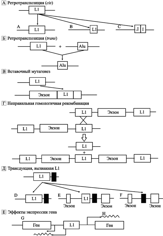 Рис. 9. Механизмы воздействия L1-ретротранспозонов на геном человека (по Ostertag E. M., Kazazian H., 2001)