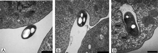 А. адгезия; Б. поглощение; В. интернализированные бактерии. mi — митохондрия. Черная маркерная полоса соответствует 0,5 мк (Greub G., Didier R., 2004).Пассирование легионелл в амебах повышает их инвазивность и вирулентность для человека. В пользу последнего предположения говорят экспериментальные данные, показавшие многократно возросшую способность L. рneumophila, выращенных в простейших, внедряться в макрофаги мышей и реплицироваться в легких по сравнению с теми же легионеллами, выращенными на искусственной питательной среде (Cirillo J. D. et al., 1994). Отдельные гены, необходимые для выживания L. рneumophila в макрофагах, такие как dot/icm, pmi и mip, также нужны им для выживания в амебах (табл. 7).