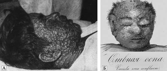 В появлении «проказы», натуральной оспы и чумы с глубокой древности наблюдается определенная цикличность. Сначала исторические источники фиксируют появление «проказы», т. е. какого-то массового заболевания у людей, сопровождающегося обширными поражениями кожи (обычно этот период тянется 2–3 века). Затем в исторических источниках появляются упоминания о злокачественной оспе, распространяющейся одновременно в нескольких странах. На этом фоне вскоре вспыхивают масштабные эпидемии чумы. На рисунке (справа) приведен фрагмент картины Конрада Витца «Прокаженный» (1450). Слева фотографии кожных поражений у больных СПИДом, взятые из монографии А. Я. Лысенко с соавт. (1996). Вверху — первичная лимфома; внизу — саркома Капоши туловища и верхних конечностей. Сходные поражения присутствуют на коже человека, изображенного К. Витцом. Разумеется, сопоставление этих изображений ничего не доказывает, но… все же интересноПостепенно количество высоковосприимчивых звеньев в цепочках увеличивается. Эпидемии приобретают упорное течение. С ростом ВИЧинфицированности населения на отдельных территориях или в СКС количество высоковосприимчивых звеньев в эпидемических цепочках возрастает настолько, что позволяет вовлекаться в эпидемические процессы возбудителям контагиозных инфекций с непродолжительным инкубационным периодом и быстрым течением болезни. Среди них тысячелетиями «лидировала» натуральная оспа, как единственная контагиозная инфекция, передающаяся воздушно-капельным путем и имеющая относительно других антропонозов продолжительный инкубационный период (до 14 суток) и высокую вирулентность для людей. Эта совокупность свойств ВНО позволяла натуральной оспе в прошлом охватывать население города (страны), распространяясь по принципу «из дома в дом», приводя к гибели людей с иммунодефицитами различной этиологии. ВНО упрощает морфологическую структуру эпидемического очага, сформированного ВИЧ или возбудителем другой нециклической инфекции. Наиболее легко в оспенные эпидемические процессы вовлекаются люди с выраженной неспособностью к Т- и В-клеточным ответам — быстрые прогрессоры и умеренные прогрессоры, инфицированные ВИЧ уже длительное время. У них инфекционный процесс заканчивается смертью от тяжелых форм болезни (purpura variolosa fulminans и variola confluens malignus, смертность до 100 %) (рис. 85).