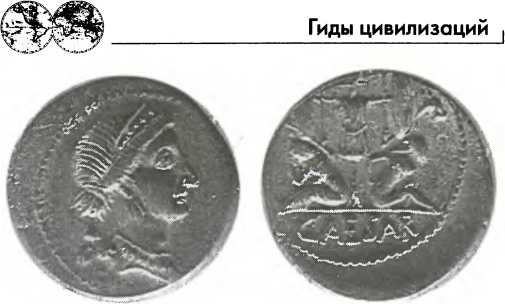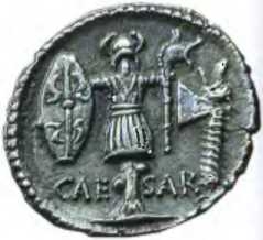 Монета Юлия Цезаря с изображение плененных галлов и трофеев. Iв. до н.э.