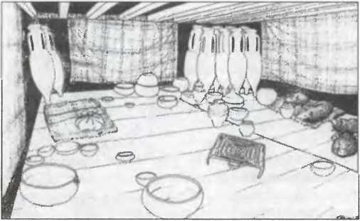 Во всех трех этих типах домов внутренность дома остается на удивление однообразной. Как правило, речь идет об одной комнате, размеры которой мало изменяются (от 3 до 10 м в длину и от 2 до 5 м в ширину). Почти всегда в комнате одна дверь. Она изрядно загромождена. Часто в центре находится очаг, который не снабжен дымоходом — дым уходит через дверь и через крышу. Спальные места, если подобные присутствуют в виде скамеек, располагаются по обеим сторонам. Остальное пространство завалено всевозможными вещами, глиняными кувшинами, горшками. Деревянные шкафы поставлены прямо на землю. В Бретани встречаются врытые в землю бадьи. В Провансе есть большие долии[28], которые тоже зарыты ниже уровня пола и от которых видно только горлышко. Таким образом, количество движимого имущества приходится ограничивать. Это главным образом мебель и кулинарные принадлежности, небольшие низенькие деревянные столики, аксессуары для очага (подставки для дров или большие таганы, крюк для подвешивания котла над огнем, медный котел, крюк для подвешивания туш и т.д.), посуда и горшки. Одежда и украшения должны распихиваться в шкаф или несколько шкафов. В домах воинов именно в таких деревянных шкафах расставлены отрубленные и загодя мумифицированные головы врагов. Несмотря на тесноту, эти дома комфортабельны. Стены из дерева и самана, а также растения, используемые при настиле крыш, устраняют влажность и поддерживают весьма ровный температурный режим. Летом свежо, а зимой не холодно — надо лишь разжечь огонь в очаге. Такая атмосфера достигается лишь ценой резкого сокращения числа проемов и того, что в помещении часто только одна дверь. Обнаружение во время археологических раскопок дверных петель и шарниров означает, что створки были предметом особо тщательной отделки. Посидоний еще во II веке до н.э. сообщает нам, что галлы никогда не закрывают свои двери на ключ. Запоры и ключи появляются только в более поздних жилищах, эпохи Галльской войны.