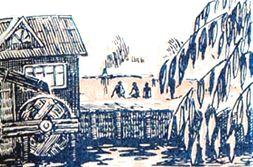 Устройство мельницы не нуждалось в каком-нибудь пояснении. Все было почти на виду. Подпертая вода по трем деревянным лоткам лилась на колеса с широкими «перьями». Валы колес деревянными шестеренками («зубья кленовые, поглядите, как кость, блестят», — объяснил мельник) соединились с валами, вертевшими жернова. Мы заглянули под крышу первого этажа в момент, когда крутились два из трех жерновов. В белом мучном тумане двое работавших тут еле угадывались. Один из мельников отгребал в мешки размол ячменя, другой в углу «ковал» жернов. «Стирается… Неделя — и надо его подымать. Вот так зубилом почешем и снова на место». От камня летели искры. Шумела за бревенчатой стенкой вода. С ровным гулом вертелись тяжелые мукомольные камни. И непрерывным ручьем из-под них лился теплый на ощупь, духовитый размол зерна. — Сколько же за день?.. — А сколько хочешь, — весело откликнулся мельник. — Мелем колхозу, мелем колхозникам, вам, если надо смолоть, — привозите! Оказалось, этот старинный снаряд может переработать в сутки четыреста с лишним пудов зерна. — Мелем и ночью — вода всегда готова работать. Мелем зимой. Ледок пообколем и запускаем — пар стоит от тепла! Мы вышли с мельником на порог. Из деревни по дороге к плотине важного вида петух вел десятка четыре кур. — Кормятся тут, у мельницы. Рыбешка тоже к этому месту льнет. — И люди? — А как же! Мельница — вроде клуба. Ожидая помола, кто брешет, кто слухает, кто песни играет. Бывает, и подерутся. Добавлю-ка я водицы… Мельник поднял затворы, и сразу же над колесами увеличился белый гребень.