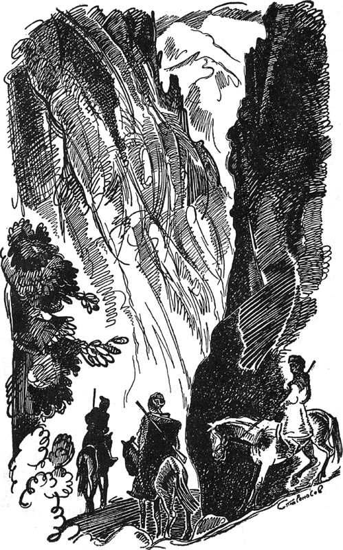 Путники едут дальше. А орел все продолжает стоять в голубой синеве неподвижной точкой. Шалико отводит от него взгляд и думает о том, что вот сейчас на повороте из-за камня выскочит спрятавшийся хевсур, одетый в такую же сетку, как он видел в городе, на большом проспекте, а за ним еще несколько также защищенных кольчугой людей и нападут на них. — Товарищ Серго! А хевсуры в сетках нападают? — Выдумал! Сетку они надевают только в торжественных случаях. — Ну, если так, то справиться с ними при нападении будет нетрудно, — уже вслух кончает свои предположения Шалико. — Э! Пусть лучше не нападают, — благоразумно вставляет Михо Баришвили. — И, посмотрев на солнце, которое бежало за гребень, замыкающий ущелья, добавил. — Так через час пути мы должны доехать до небольшого селения. В нем когда-то я бывал. Надо нам там переночевать.