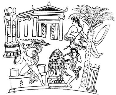 На аккадском рисунке: Энки (Эйа), в образе Змия, раскрывает тайну смертоносного Потопа Атрахасису и убеждает его построить Ковчег.