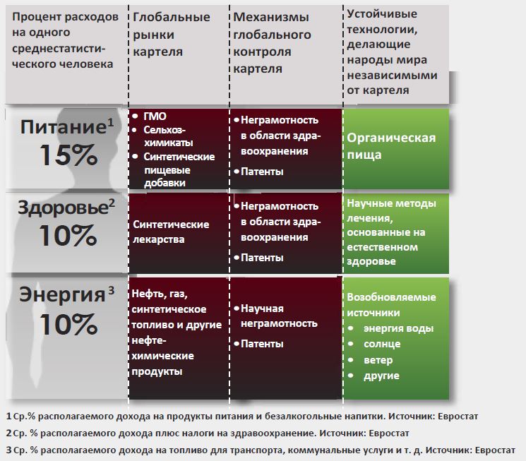 • Защита продовольственного снабжения Генетическая информация, содержащаяся в животных, растениях и продуктах питания, выращиваемых тысячелетиями, принадлежит всем нам. Манипуляции и изменение генетического кода жизни с целью патентования и создания глобальных рыночных монополий несут опасность того, что наши запасы продовольствия контролируются и используются корпоратократией в политических целях.