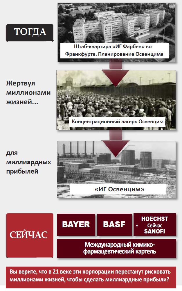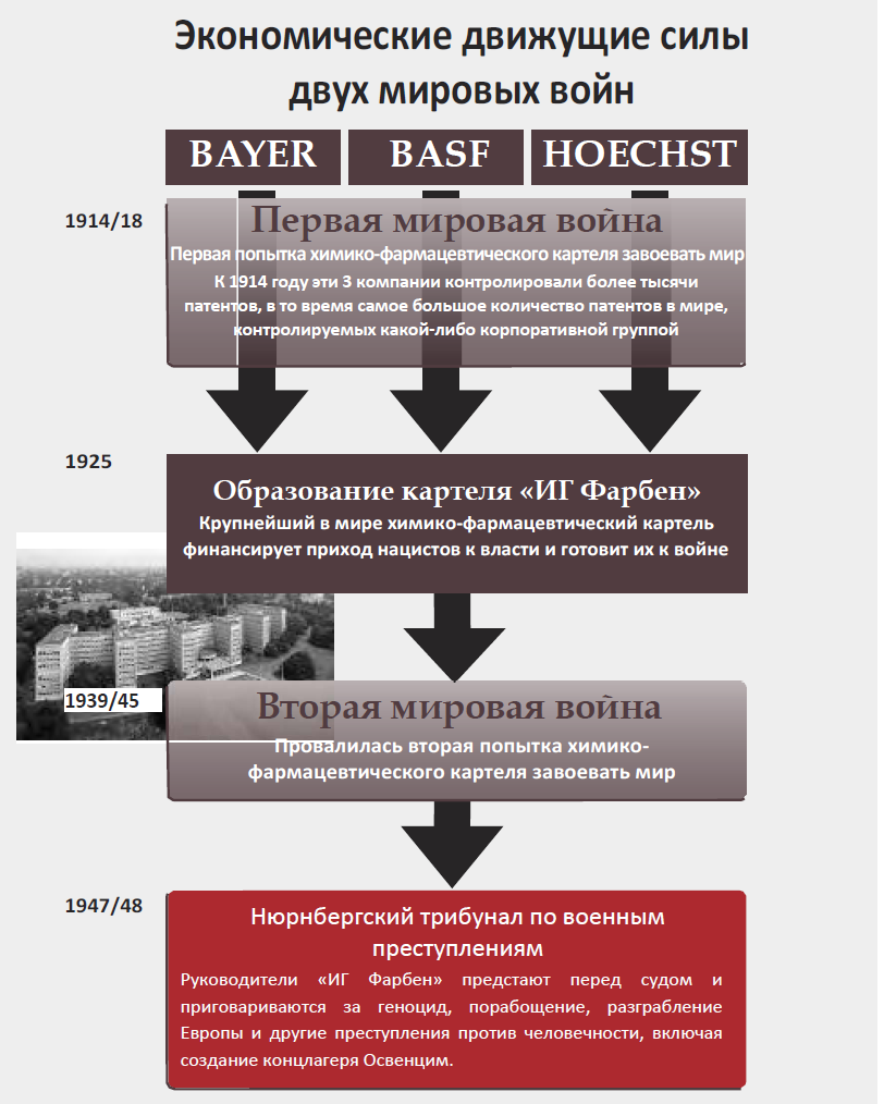 После 60 лет молчания онлайн-архив Profit Over Life открывает людям во всём мире отчёты Нюрнбергских военных трибуналов против ИГ Фарбен, крупнейшей химико-фармацевтической многонациональной компании в первой половине 20-го века. Десятки тысяч документов, содержащихся в архиве, однозначно свидетельствуют о том, что Вторая мировая война – война, унесшая жизни более 60 миллионов человек – была спланирована и финансировалась картелем ИГ Фарбен, в то время состоявшим из компаний Bayer, BASF, Hoechst и других.