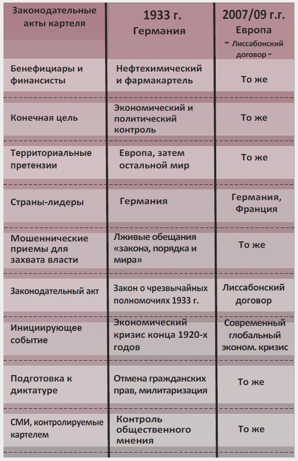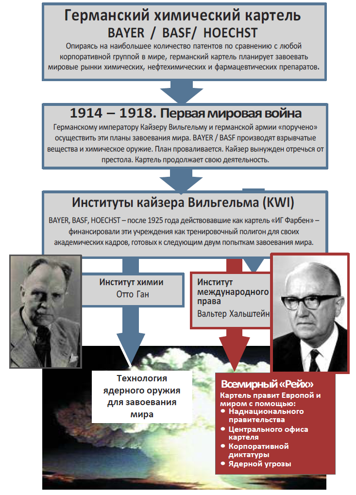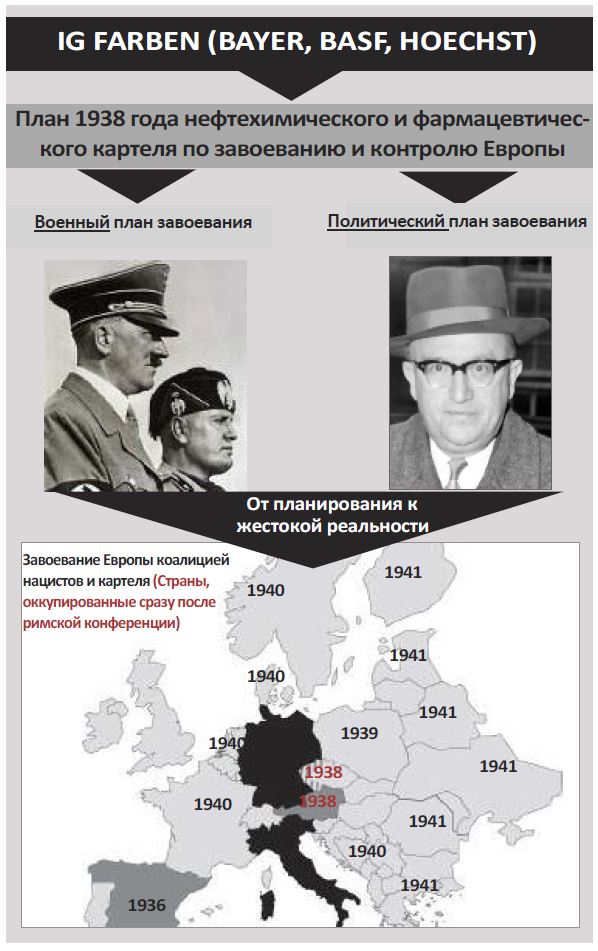 В этой книге рассказывается о том, что многие читатели могут по очевидным причинам сначала отвергнуть. Они могут заявить, что если бы задокументированная здесь столь серьёзная историческая информация была правдой, они, несомненно, услышали бы об этом раньше. Учитывая это, мы, авторы, сочли своей обязанностью побудить наших читателей не только прочесть эту книгу, но и обратиться к документальным источникам, указанным в сносках на её страницах. Почти три четверти века миру твердили, что Вторую мировую войну развязал психопат Адольф Гитлер и окружающие его бандиты-расисты – нацисты. Однако факты говорят о том, что война велась от имени химического, нефтяного и фармацевтического картеля, желавшего заполучить контроль над зарождающимися мировыми рынками патентованной химической продукции стоимостью в триллионы долларов. Официальные документы Конгресса США и Нюрнбергского трибунала по военным преступлениям недвусмысленно свидетельствуют о том, что Вторая мировая война была не только подготовлена, но и материально и технически обеспечена крупнейшим и наиболее известным в то время нефтехимическим и фармацевтическим картелем, а именно германским картелем «И.Г. Фарбен», в состав которого входили Bayer, BASF, Hoechst и другие химические компании. В выводах обвинительного заключения доказывается, что без «И.Г. Фарбен» Второй мировой не могло быть. Из этой книги вы также узнаете о том, что Первая мировая война, ещё одна крупнейшая трагедия двадцатого века, была фактически первой попыткой завоевания мира этими корпорациями. Более того, претерпев неудачу в покорении Европы и мира военным путем, химико-фармацевтический картель вложил средства в третью попытку: это экономическое и политическое завоевание Европы посредством «Брюссельского ЕС». Поэтому неудивительно, что главные архитекторы Брюссельского ЕС были набраны из числа тех же технократов, которые уже разрабатывали планы послевоенной Европы, завоёванной коалицией нацистов и картеля. Эта книга познакомит вас с представителями картеля, одетыми не в военную форму, а в серые костюмы, самым известным из которых был Вальтер Хальштейн, первый председатель так называемой Еврокомиссии. Ответ на вопрос, почему вы, вероятно, не слышали об этих потрясающих фактах раньше, прост. После 1945 года картель инвестировал сотни миллиардов долларов только с одной целью: переписать историю и прикрыть своё криминальное прошлое. Эта маскировка корпоративных истоков двух мировых войн, была, очевидно, предварительным условием для третьей попытки картеля – на этот раз через брюссельский ЕС – завоевать Европу и установить над ней контроль. Очевидно, картель надеялся укрепить свой контроль над Европой через брюссельский ЕС таким образом, чтобы никто не узнал об этом тёмном прошлом. Однако этот план провалился. Публикация этой книги и десятков тысяч подлинных документов, ссылки на которые в ней приводятся, означает, что эксперимент с брюссельским ЕС окончен. Ни один демократически настроенный человек, организация или партия не могут теперь поддержать эту третью попытку завоевания Европы. Эта книга также дает уникальную возможность всем тем политикам и политическим партиям, которых привлекли к поддержке брюссельского ЕС и которые не знали о его происхождении и не понимали его истинного назначения. С