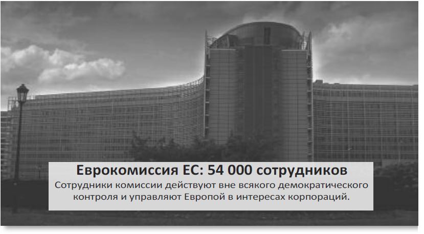 Брюссельский ЕС представляет себя миру как парламентскую демократию с Европарламентом, играющим решающую роль. Однако исполнительные решения и разработка всего законодательства осуществляются Еврокомиссией и её персоналом численностью более 54 000 человек. Из своих офисов в штаб-квартире комиссии в Берлемон-билдинг и в других местах эта оплачиваемая армия профессиональных бюрократов разрабатывает законы Европы в интересах корпораций.