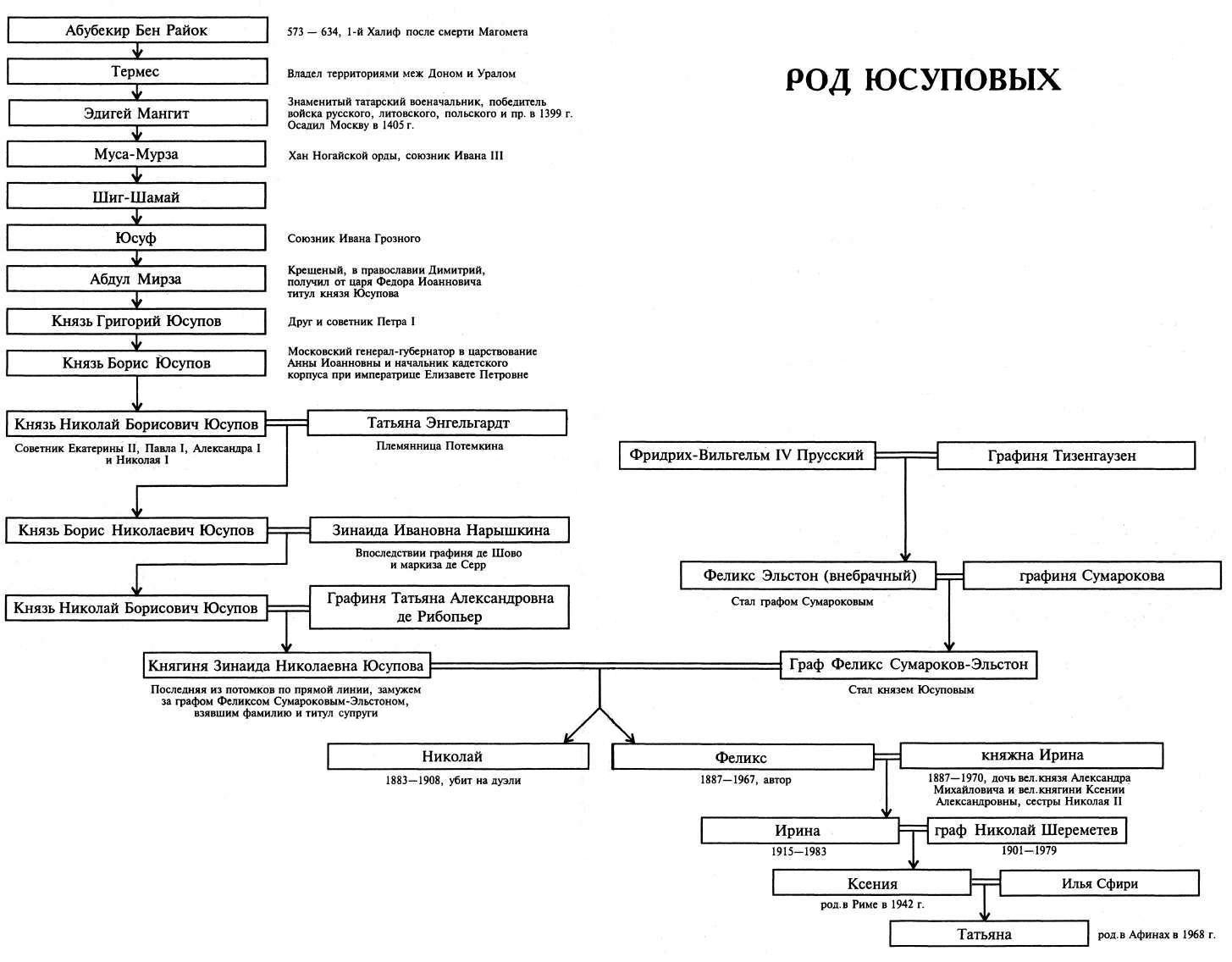 «После изгнания» для него, конечно же, не пришло… С опубликованием «Мемуаров» князь волей-неволей опять заставил заговорить о себе. Уж и прежде на революцию, Лжеанастасию, фильм о Распутине журналисты слетались, как мухи на мед. Кстати, кериолетское дело он выиграл, зато проиграл процесс с американским телеканалом. В эмиграции многие из его соотечественников, неимущих или несчастных, вечно пользовались неистощимой добротой его. Постепенно князь отошел от светской суеты и последние годы жил у себя на улице Пьер-Герен. Умер он в 1967 году, княгиня – в 1970-ом. Дочь их Ирина, в замужестве графиня Шереметева, унаследовала застенчивость от матери и художественный вкус и чувство юмора от отца. Жила она между Афинами и Парижем. Умерла в Париже в 1983 году. Ее дочь Ксения живет в Афинах с мужем Ильей Сфири и дочерью Татьяной. Они часто бывают в Париже, живут в пьер-гереновском доме. После революции Ксения одна-единственная побывала на своих предков. На похоронах Юсуповых на кладбище Сент-Женевьев-де-Буа на гроб им по традиции бросили горсть родной земли. Вернутся ль они когда-нибудь в семейную могилу в Архангельском?ПРИЛОЖЕНИЯ