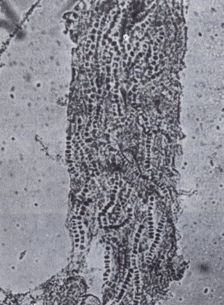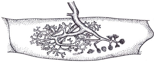 Поперечный разрез через веточку кустистого лишайника, на котором хорошо видны клетки водоросли между гифами гриба