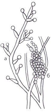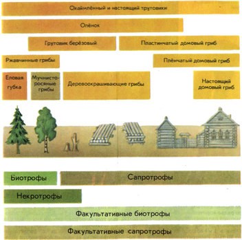Все многообразие грибов — это многообразие прежде всего тех их структур (плодовых тел и др.), на которых образуются споры, служащие для размножения. В процессе эволюции грибов именно они претерпели наибольшие изменения, связанные с увеличением количества образуемых спор и совершенствованием способов их распространения. Что же касается вегетативного тела гриба, выполняющего функции питания, распространения по субстрату, дыхания, то у большинства грибов это мицелий (или грибница), состоящий из многочисленных тонких ветвящихся нитей — гиф. По внешнему виду мицелий часто сходен даже у далеких по происхождению грибов, в отличие от разнообразных органов спороношения, образующихся на нем. Его гифы обычно очень тонкие и не превышают по толщине 5-6, реже — 10 мкм. Окраска их от белой, желтоватой до темной — оливковой, бурой или черной. Иногда встречаются грибы с яркоокрашенным мицелием — розовым, желтым, красным. Таким образом, довольно распространенное деление грибов на макромицеты и микромицеты условно, так как вегетативное тело у тех и других — это микроскопический мицелий.