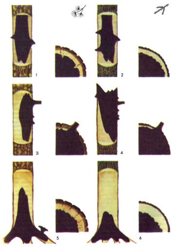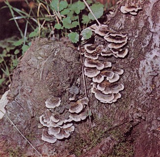 Однако так называемые шляпочные грибы — только один из многочисленных типов плодовых тел макромицетов. У грибов, обитающих на древесине, часто можно встретить боковую шляпку, лишенную ножки, или шляпку со слаборазвитой ножкой, например у вешенки. Очень разнообразны плодовые тела трутовиков. Копытообразные твердые плодовые тела имеют настоящий и окаймленный трутовики; подушкообразные, мягкие в молодом возрасте — березовая губка; расположенные черепитчатыми группами, тонкие — кориолус многоцветный, стереум жестковолосистый; распростертые, как бы обволакивающие субстрат — флебия гигантская. У некоторых трутовиков основание плодового тела вытягивается в более или менее длинную ножку, например у лакированного трутовика. Размеры плодовых тел у трутовиков, как и у шляпочных грибов, колеблются в широких пределах — от гигантских, размером до 0,5-1 м (плоский трутовик, настоящий трутовик и некоторые другие), до крошечных, не превышающих в диаметре 0,5-1 см.