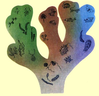 Схема эволюции живого мира, где грибы занимают промежуточное положение между животными и растениями