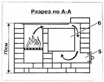 Подчас хозяева двухэтажных дач и домов желают иметь печь на первом этаже, а обогревательные каналы (щиток) печи — на втором. За счет этого щитка будет производиться обогрев второго этажа. Такую печь-(а) можно топить каменным углем, для этого ее топку нужно класть из огнеупорного шамотного кирпича. На таком кирпиче плохо держится штукатурка из глинопесчаного раствора, приготовленного из красной глины, поэтому лучше применить для раствора огнеупорную глину. В основе своей это кухонная печь, которая подсоединяется к газоходу в капитальной стене или к отдельно стоящей трубе, но в последнем случае большая часть тепла будет уходить на улицу. Лучше всего сделать печь вплотную к капитальной внутренней стене дома-(б). Если толщина капитальной стены-1 полтора кирпича, то газоход от печи-2 выкладывается заподлицо со стенкой. Помня о возможной в будущем перекладке печи, газоходы лучше класть в середине стены, без перевязки друг с другом, на слабом сложном (т. е. с добавлением извести) цементном растворе. На таком же растворе делают и капитальную стенку. При толщине стенки в один кирпич газоход-3 будет выступать на половину кирпича внутрь комнаты. Но надо учесть то, что на втором этаже будет обогревательный щиток (в), которому нужна опора-поддержка. Тогда вверху первого ряда в том месте, где будет обогревательный щиток (в), нужно расширить капитальную стенку-4 с двух сторон за счет напуска, состоящего из трех рядов, до толщины в полтора кирпича. Для чистки газоходов делаются окна чистки-5, куда вставляются плотно закрывающиеся дверки, которые хорошо видно в третьем и четвертом рядах. Для чистки отопительного щитка на втором этаже, окна чистки закладываются в щитке с любой его стороны. Лучшее место окон чистки показано пунктиром в щитке (в). Если потолочное перекрытие деревянное, то нужно в местах, где проходят газоходы, с помощью напусков кирпича сделать разделку (расширение стенки) в один кирпич от внутренней стенки газохода. У перекрытия еще кладется в один слой листовой асбест. Пол второго этажа также должен быть обезопасен от пожара, как и потолок, для этого на втором этаже можно положить керамическую плитку или затереть зажелезненным раствором. При железнении сырой гладковыровненный раствор припудривается (покрывается) тонким слоем сухого цемента. После того как цемент намокнет, его слегка заглаживают мастерком. Получится гладкая блестящая поверхность. Обогрев второго этажа происходит так. В печи (а) готовится пища. Газы вдут вокруг духового шкафа-6 и попадают в большой газоход. Если этот газоход сразу соединить с трубой, то из нее будут вылетать искры, так как в газоходе высокая температура. Для того чтобы в газоходе было меньше сажи, канал-7 сделан больше других каналов. Газы из канала-7 попадают в два спаренных канала-щитка-8, которые идут к полу, после чего поднимаются вверх и через две задвижки-9 уходят в трубу. На рисунке 1 — общий вид печи на первом этаже, на рисунке 2 — вертикальный разрез этой печи по А-А, на рисунке 3 — вертикальный разрез этой печи по Б-Б, на рисунке 4 — вертикальный разрез по А-А (второй этаж), на рисунке 5 — щиток на втором этаже, на рисунке 6 — горизонтальные разрезы каждого ряда (порядовки).