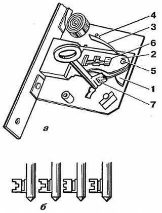 Рис. 3. Замок с сувальдиым механизмом: а — в сборе; б — варианты бородок ключей; 1 — ригель (засов); 2 — сувальда; 3 — пружина сувальды; 4 — упорный штифт; 5 — ось; 6 — запорная стойка; 7 — бородка ключа