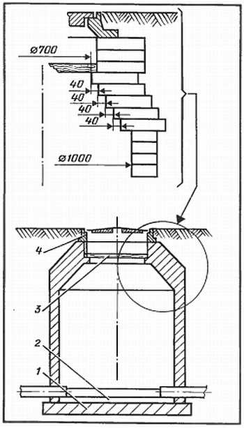 Рис. 4. Смотровой колодец: 1 — основание; 2 — лоток; 3 — крышка внутренняя, 4 — люк