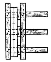 Окончательно отверстия рассверливают под диаметр несколько меньший, чем диаметр нагеля (чтобы он входил с небольшим натягом). Нагели ставят на клею ПВА в одну кромку каждой доски так, чтобы направляющие концы нагелей были снаружи. Затем выступающие концы нагелей и кромки сплачиваемых двух досок намазывают клеем. Плотно сбивают их киянкой и стягивают в клиновом прессе (рис. 5). Выдерживают первую сплоченную пару досок не менее 8 ч, затем наращивают третью доску, стягивают все в клиновом прессе и т. д.