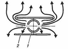 Рис. 9. Схема увлажнения почвы из внутрипочвенного увлажнителя: 1 — увлажнитель; 2 — пленка