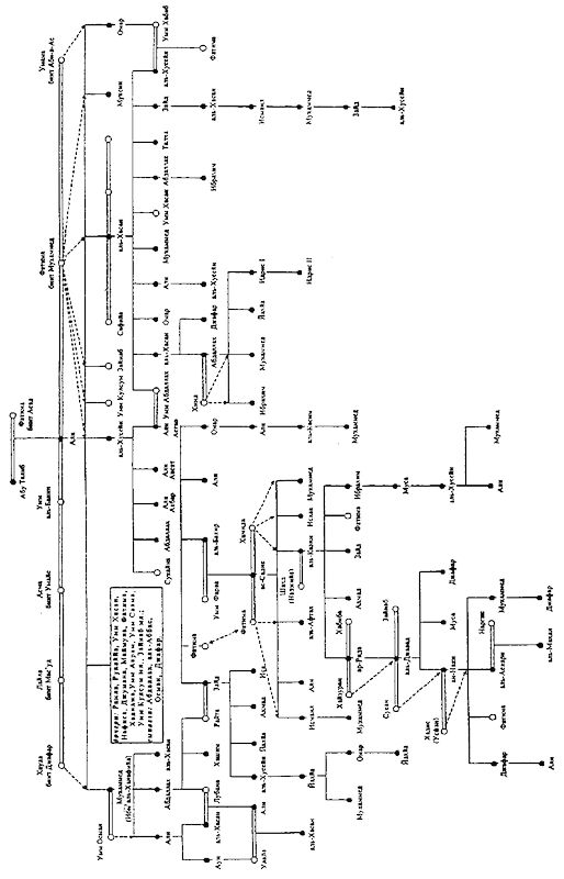 У известного средневекового риторика и филолога Абу-л-Хусейна Ахмада ар-Рази (ум. ок. 1005 г.) и его современника аль-Бируни мы можем найти полное имя Мухаммеда, а следовательно, и всю общепринятую мусульманами родословную (араб. — насаб) Пророка по мужской линии: Мухаммед ибн Абдаллах ибн Абд аль-Мутталиб ибн Хашим ибн Абд Манаф ибн Кусайй ибн Килаб ибн Мурра ибн Ка'б ибн Лу'айй ибн Галиб ибн Фихр ибн Малик ибн ан-Надр ибн Кинана ибн Хузайма ибн Мудрика ибн Илйас ибн Мудар ибн Низар ибн Ма'ад ибн Аднан[122]. Последний из перечисленных предков Мухаммеда, как мы помним, был потомком библейско-коранического пророка Измаила. Простая возможность сохранения в памяти подобной, пусть даже и легендарной, многовековой родословной должна вызывать чувство уважения, но никак не удивления: каждый бедуин обязан был знать всех своих предков вплоть до 12-го колена.