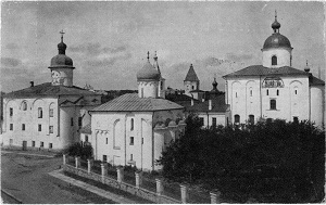 Ярославово дворище; слева направо: церковь жён-мироносиц, XII–XVI вв., церковь Прокопия, 1359–1529 гг. Вечевая башня, 1472 г., Николо-Дворищенская церковь. 1113 г.