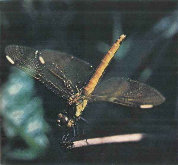 В расплывчатом зеленом мареве по жилке листа ползло длинное изящное существо, неся на себе просторный, отливающий перламутром балахон крыльев. Оно двигалось медленно, грациозно кланяясь и вертя глазастой головой. Золотые глаза сверкали, посылая во все стороны изумрудно-бронзовые лучи… В багряной чаше цветка суетился кто-то черный, пластмассовый. Кто это? Что он делает? Откуда он здесь? Как великолепно сочетается этот черный, блестящий панцирь с оранжевыми, огненными лепестками! С умопомрачительной высоты плюхнулся сразу на все шесть лап-шасси толстый лайнер, и зеленая, ровная, покрытая густыми короткими волосками, словно ковром, посадочная площадка мягко спружинила под ним. Поворочав в разные стороны головой, «лайнер» вдруг принялся умываться, как кошка, чиститься. Прозрачные крылья засверкали на закатном солнце.