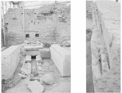 Остатки конструкции в Хангхаусе, Эфес (слева). Следы от пиления на мраморном блоке (справа).