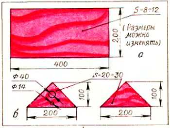 Строить ее надо с «чердака», для чего вырезаем прямоугольный кусок фанеры (8-12 мм толщиной) (рис. 2, а), затем две стойки (рис. 2, б).
