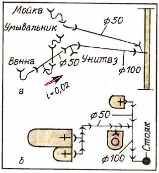 Перед соединением на резьбу необходимо намотать льняную прядь, смоченную в какой-либо масляной краске. С канализацией дело обстоит несколько сложнее. Канализационная труба должна быть выполнена с уклоном 0,02 (2 см на 1 м длины). Первоначально канализация была выполнена вдоль стены по оси 2 (рис. 6).