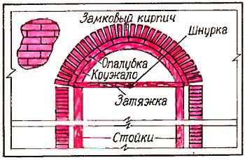 Арочные перемычки кладут из обычного кирпича с клинообразными швами. Правильность укладки кирпичей и радиальность швов нужно проверить по шнуру, одним концом закрепленным в центре окружности (эллипса). Этот центр находится в середине бруска затяжки (рис. 8).