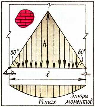Ригель работает как простая балка, шарнирно опирающаяся на простенки. Однако на этот ригель действует не весь вес вышележащей кирпичной стены, а только часть (заштрихована), поскольку внутри кладки образуется самонесущий свод. Наибольшая нагрузка возникает в средней части балки, она рассчитывается по формуле: q = Р∙b∙h∙γ, где Р — объемный вес кирпичной кладки (Р = 2000 кг/куб. м); b — толщина стены; h — высота давящей на балку кладки; γ = 1,1 — коэффициент надежности. h = l∙sin α = l∙sin 60° = l∙√3/2. Максимальный момент, возникающий в середине балки, равен: Mmax = q∙l2/12 Балка под действием веса кирпичной кладки стремится прогнуться вниз. Самая опасная точка в середине. В этой точке максимального момента возникает напряжение, стремящееся разорвать балку. Значит, наша задача — не допустить возникновения в ригеле напряжения больше допустимого. Для металла, из которого изготовлен швеллер: Rдоп = 2100 кг/кв.см. Следовательно: σ = Mmax/W =< Rдоп, где σ — напряжение, возникающее в металле; W — момент сопротивления металла. Значения Mmax и Rдоп известны, необходимо найти W — момент сопротивления: W = Mmax/Rдоп Получив при расчете W, необходимо по сортименту горячекатаных изделий определить номер швеллера. Учитывая, что у нас в стене работают два швеллера, определим по сортименту: Wх = W/2 Швеллер выбирается в большую сторону. При расчете не запутайтесь в единицах измерения: q = Р∙b∙h∙γ = кг/м3∙М∙М = кг/м; Mmax = q∙l2/12 = кг∙м/кг/см2 = кг∙м; W = Mmax/Rдоп = кг∙м/кг/см2 = кг∙100∙см2/кг = см3 На конечном этапе расчета метры нужно перевести в сантиметры. На балку, работающую в несущей стене, действует дополнительная распределенная нагрузка от плит перекрытия (рис. 13).