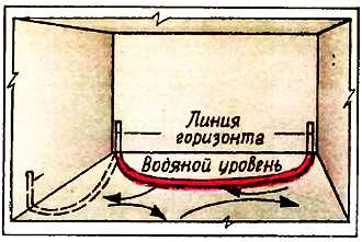 Подготовка под паркетные полы должна быть идеально ровной. Для этой цели необходим водяной уровень. Водяной уровень представляет собой две стеклянные трубки, соединенные между собой резиновым шлангом. В уровень доливается вода, по закону сообщающихся сосудов вода займет соответствующее горизонту положение в обеих стеклянных трубках. По положению воды в трубках на стенах отчеркивают горизонт (рис. 25). Горизонт отчеркивают на всех четырех стенах последовательно, перемещая трубки уровня. Отчеркивая горизонт, вы должны прийти в ту же точку, откуда начали. На какой высоте от пола отчеркивать горизонт — безразлично.