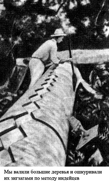 Мы приступили к строительству нашего второго дома… На этот раз на берегу океана. Единоличным владельцем долины Уиа был Теи Тетуа, он не взял с нас никакой платы за участок. Мы — его гости, и все, чем он владел, принадлежало также и нам. "Усадьба" старика располагалась в пальмовой роще на берегу, на платформе, за прочной каменной оградой, сделанной для защиты от полчищ диких и полудиких свиней. Вдоль ограды текла речушка. На ее противоположном берегу как раз было место для нашего домика. От пляжа наш участок отделялся галечным барьером, сооруженным прибоем. Широкая бухта с изумрудной водой, вечно исчерченная белыми гребнями волн, переходила в голубую бесконечность океана. Вот где приволье и чистый воздух! Неугомонный пассат круглый год дует с востока, гоня прочь из рощи комаров и прочую мошкару. Только в лесу они находили убежище и плясали роями, эти бесы, которых сюда доставили белые. Старик посоветовал нам строиться основательно. Он долго сокрушался, узнав, какая судьба постигла нашу бамбуковую хижину. …Ханатива — так называлась маленькая долина, в которую мы попали, обогнув скалистый мысок. Здесь среди зарослей миру и борао стояли старые стены, склепы, истуканы, но мы пришли сюда за строительным лесом. Старик легко карабкался вверх по стволам, отбирая для нас самые прямые, крепкие деревья миру. Сперва с них снимали кору, колотя ствол камнями; после этого связывали вместе по нескольку штук гладких тяжелых бревен. Мое голое плечо превратилось в болезненную рану, а ноги покрылись ссадинами, после того как я несколько раз прошелся с ношей по скалам. А Теи играючи нес свою поклажу. Он от души смеялся, когда я испуганно замирал на месте, цепляясь за камни там, где волны захлестывали тропинку. На мысу мы бросали бревна в море и возвращались за следующей связкой. Течение само несло стволы через залив и выкидывало их на берег как раз возле нашего участка. Мы ставили дом на сваях, чтобы оградиться от непрошеных гостей. Сам домик был низкий, с крышей из пальмовых листьев, с тремя стенами; входили в него по лесенке. Вдоль задней стены на полу тоже настелили пальмовые листья. Трудно представить себе лучшее жилье; всегда свежий воздух и ни единого комара. Я хотел рядом соорудить кухню, но тут старик воспротивился. Раз мы гостим в долине Теи Тетуа, значит и есть должны вместе с Теи Тетуа. Он забрал наш котелок и унес его к себе. Так начались наши самые чудесные дни в Полинезии. Лив и Момо отлично подружились. Момо исполнилось десять лет: почти взрослая! Она была очень рада новой подруге и охотно обучала ее тему тому, что должна уметь хорошая вахина. Они плели циновки из листьев пандануса, изготовляли арканы из луба борао, при помощи колотушки превращали кору хлебного дерева в тапу— материал для одежды. Делали украшения из цветов, браслеты и бусы из красных горошин и причудливых плодов. Как-то Момо пришла к нам с миской из скорлупы кокосового ореха и показала странную кашицу. Все тело и смеющуюся рожицу девочки покрывали узоры, нанесенные желто-зеленой растительной краской. Теперь она хотела и Лив раскрасить в соответствии с требованиями древней косметики!.. Пока женщины занимались домашними делами, Теи и я отправлялись в лес за съестными припасами. Фруктов здесь было множество, недоставало только феи. Плоды хлебного дерева, бананы, манго, папайя, ананас