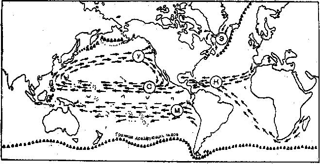 Атлантический океан: Э — маршрут Эйриксона и норманнов от Норвегии до Северной Америки. К — маршрут Колумба и европейцев средневековья от Канарских островов до тропической Америки. Тихий океан: М — маршрут Менданьи от Перу до Полинезии и Меланезии. С — маршрут Сааведры и последующих каравелл из Мексики к Малайскому архипелагу. У — маршрут Урданеты от Малайского архипелага до Северо-Западной Америки. «Кон-Тики», «Ра-I», «Ра-II» — маршруты Т. Хейердала, пройденные на плотах и папирусных ладьях по морским путям древних мореплавателей.