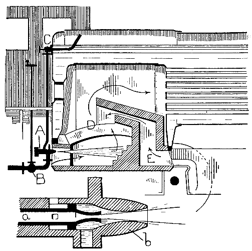 Рис. 4. Форсунка для сжигания нефти в топке паровоза. Состоит (см. рис. внизу) из двух сопл: нефтяного — b и парового — а. Пар, вырываясь из сопла а, распыляет нефть и вдувает ее в топку. На рисунке вверху: А — форсунка, В — вентиль, регулирующий приток нефти, С — паровой клапан, D — сводики из огнеупорного кирпича, раскаляемые пламенем и служащие для лучшего сгорания топлива. Е — канал для притока воздуха в топку.Отказавшись от нефти, мы должны будем признать, что главным топливом для паровозов служит каменный уголь, за исключением стран, где очень много леса, и он крайне дешев, там выгоднее топить котлы паровоза дровами, но таких стран немного. Почти повсеместно паровозы отапливаются каменным углем и к нему приурочивают и устройство — топок и котлов. В последнее время паровозы начинают отапливать угольной пылью (мусором), которая была отбросом на угольных копях, и даже крупный уголь размалывают в пыль. Угольная пыль как топливо для паровозов во многом напоминает нефть. Пыль насыпают в тендер из бункера — огромного ящика, поднятого над путями железной дороги — по трубе; пыль насыпается на тендер «сама собой». Из тендера в топку пыль подается также трубой, а в топке раздувается в форсунках, подобно нефти, только не паром, а воздухом, нагнетаемым особой воздуходувкой; пламя угольной пыли получается большое, напоминая нефтяное; таким образом, облегчается труд кочегара, а топливо используется вполне.