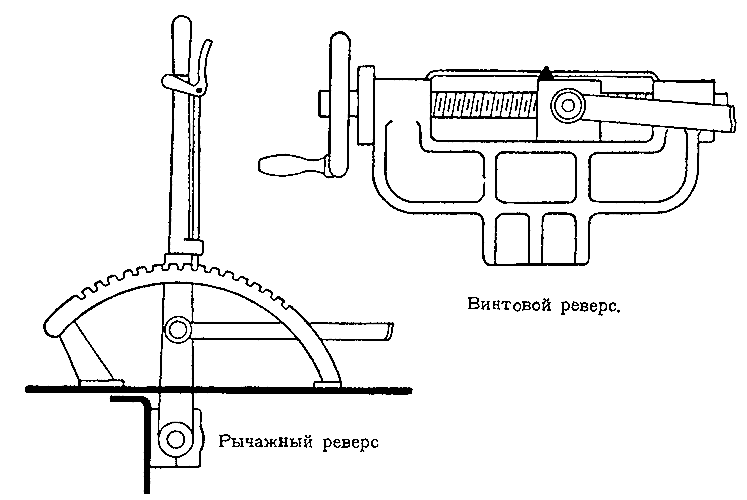 Тяга от переводного рычага проведена в будку к машинисту; он может передвигать эту тягу при помощи винта с колесиком и рукояткой — это устройство и называется реверс (см. рис. 14), потому что машинист при его помощи реверсирует (меняет на обратный) ход паровоза, а также меняет отсечку: когда паровозу трудно везти или сдвинуть поезд с места, машинист устанавливает реверсом камень кулиссы в крайнем положении, и паровоз работает свежим паром со всей доступной ему мощностью. Переменять ход реверсом принято после полной остановки паровоза. К «контр-пару» на ходу мы прибегаем только в случае надобности экстренно остановить паровоз.