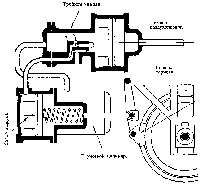 Задний балансир имеет два прореза, и в каждом прорезе — призма. При горизонтальном положении балансира он опирается на левую призму. Когда надо увеличить сцепной вес, на правое плечо балансира нажимает пятой рычаг от пневматического (воздушного) привода, отчего балансир наклоняется правым концом вниз, и опора его переходит на вторую призму. От этого балансир стал неравноплечим, и теперь на его правое плечо приходится больший груз, чем на левое, т.-е. груз с заднего бегунка перенесен на ведущие колеса; рама паровоза чуть-чуть приподнялась над бегунковой осью, разгрузив ее рессоры. И паровоз может теперь, не буксуя, использовать всю тяговую силу своей машины — поезд трогается с места. С этого момента я и начал свой рассказ о паровозе. Вернитесь к началу нашего рассказа. Если вы внимательно следили за его развитием, и особенно, если вы с живым интересом проделали опыты с подвижным рисунком кулиссного механизма и испытали свои силы на постройке модели, вы взглянете теперь на паровоз иными глазами. Движение его для вас больше не загадка. Я должен бы еще для полноты описать воздушный тормоз Вестингауза, неотъемлемую принадлежность каждого современного паровоза. Но устройство воздушного тормоза довольно сложно и нужно написать о нем не меньше, чем я написал о паровозе, чтобы понять его. Здесь же будет довольно, если я скажу, что тормоз Вестингауза, или просто «вестингауз», действует сжатым воздухом, который накачивается особым насосом, движимым паровой машинкой, помещенной сбоку на площадке паровоза. Воздух нагнетается вестингаузом в прочные клепаные резервуары, устроенные на паровозе (под котлом), тендере и под каждым вагоном, по поездной трубе, проложенной под вагонами во всю длину поезда с соединением посредством резиновых шлангов между вагонами. На паровозе, тендере и, у каждого вагона устроен небольшой цилиндр с поршнем, шток которого соединен тягами с тормозными колодками; если под поршень впустить сжатый воздух, он с силой выдвигает поршень и прижимает колодки тормозов к колесам, затрудняя и даже совсем прекращая их вращение. Тормоза все действуют автоматически, как только выпущен воздух из поездной трубы; кран, выпускающий воздух из трубы, находится у меня под рукой в будке машиниста. Когда я хочу затормозить паровоз и поезд, я поворотом «крана машиниста» выпускаю воздух, и вестингауз тормозит (рис. 16); если я другим поворотом крана впущу в поездную трубу воздух из запасного резервуара паровоза, клапаны тормозов автоматически закрывают доступ воздуха в тормозной цилиндр из резервуаров, выпускают воздух из тормозного цилиндра, и колодки, оттягиваемые пружинами, отходят и освобождают колеса — это называется «отпустить тормоза».